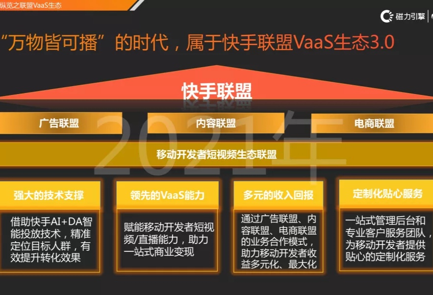 不同于PC和搜索时代的联盟1.0,以及移动互联网和图文时代的联盟2.0,面向短视频和直播时代的快手联盟,定位为基于移动开发者的短视频商业生态联盟3.0。快手联盟要做的,是将自身的短视频与直播能力作为基础设施输送给开发者,“打着联盟的旗号,做2B的业务”。 以VaaS(视频即服务)为核心框架,快手联盟整合了内容、广告与电商三种能力,内容为载体,广告和电商做变现。