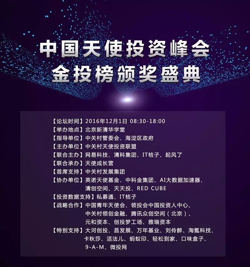 “洞见 · 未来——2016中国天使投资高峰论坛暨颁奖盛典”将于12月1日在北京新清华学堂盛大开幕。